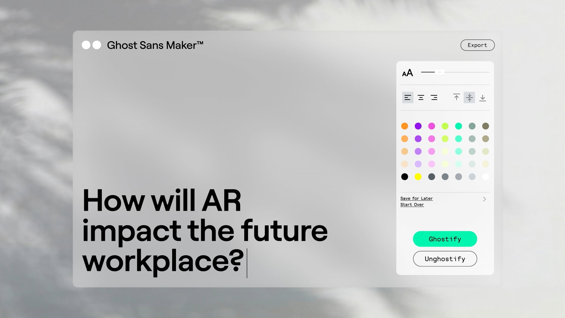 Ghost's color palette thoughtfully combines functional, neutral, and vibrant hues to reflect the diversity of Ghost projects, and to convey the depth and variety of the AR experience. It feels distinctive and forward-looking, while still harmonizing with the established Snapchat palette.