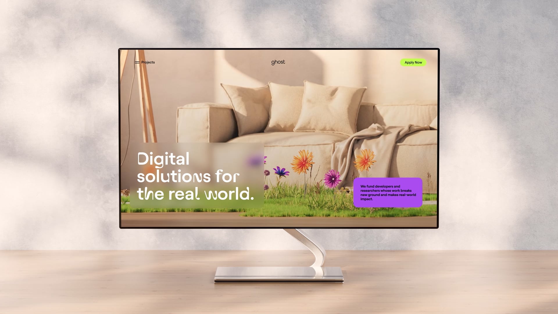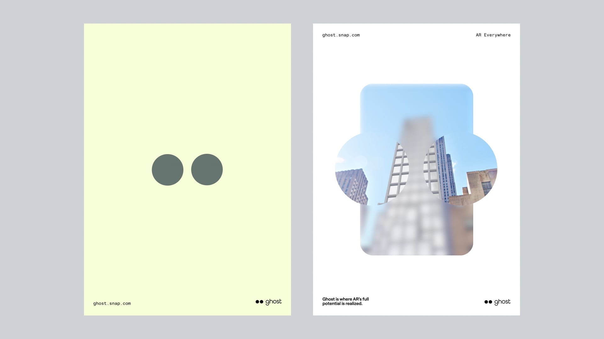We continued to unpack the concept of a brand that stands back and gives space through a system of layered panels that appear throughout the Ghost identity. These layers make room for the multiplicity of AR and the variety of projects at Ghost. The system allows for the combination of project elements from different makers, and enables the brand to show the progression of project elements from draft through development to finished product.